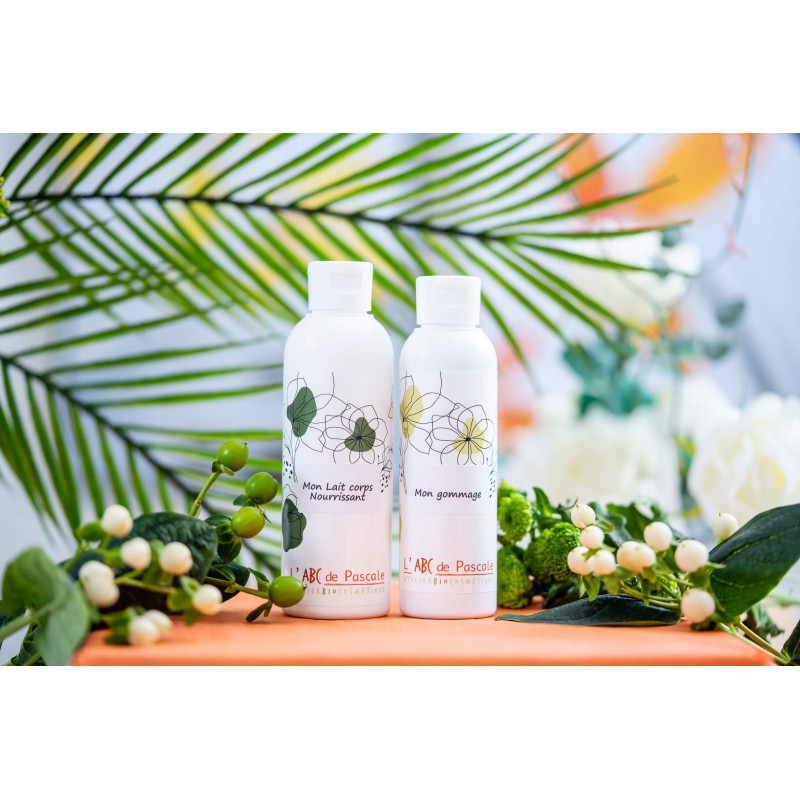 Un lait corps nourrissant et réparateur au miel de thym (200mL) (parfum lotus) et un gommage corps Gourmand au Litchi et parfum miel (150mL)